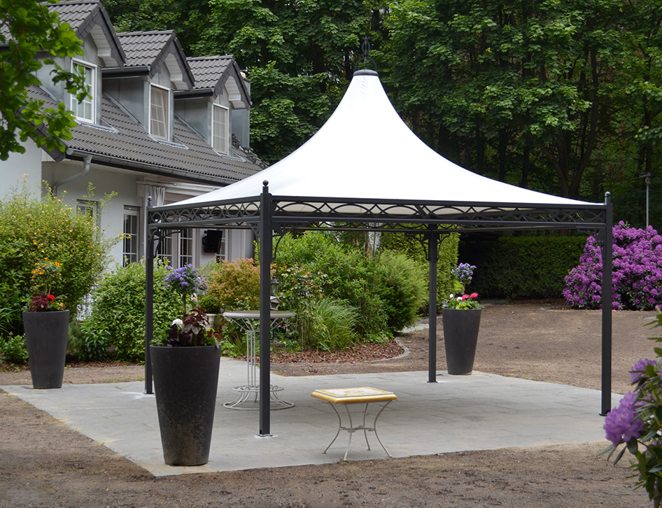 Wie eine exklusiv gestaltete Theaterbühne erscheint der Garten-Pavillon Roma in 3x3 Metern mit weißem Pagodendach. Mehr ...