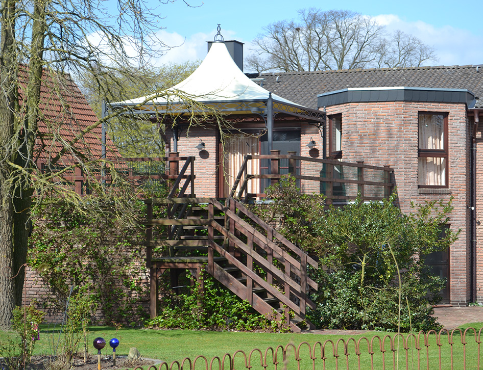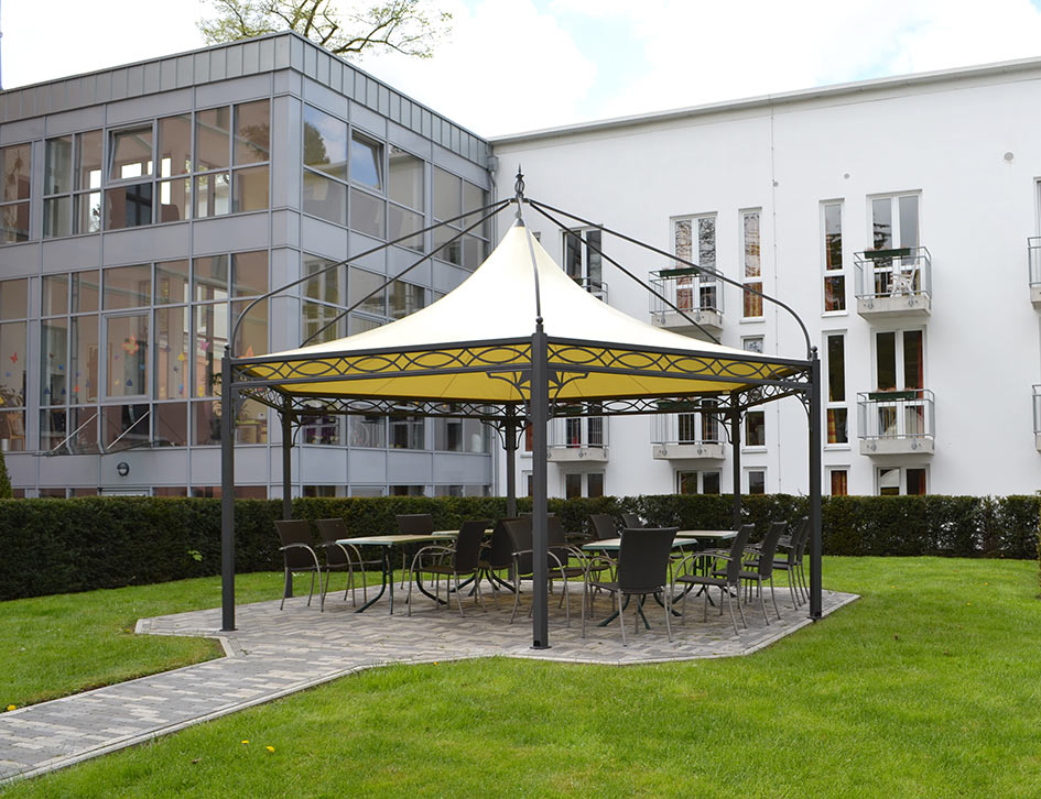 Passt perfekt zur Fassade: Pavillon Roma 4x4 vor dem NordWest-Hotel Amsterdam in Bad Zwischenahn. Mehr ...